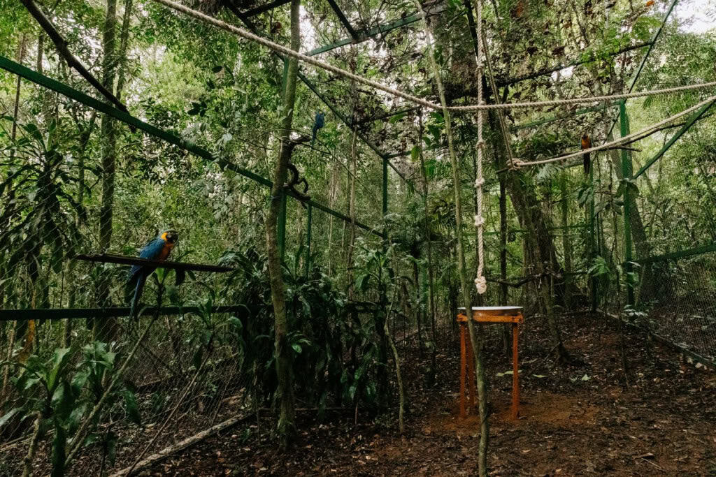 Agora, as araras-canindés estão no Parque Nacional da Tijuca, na Zona Norte do Rio. Em um recinto especial construído pela Unidade de Conservação, as aves passam por treinamentos para retornar ao ambiente natural.