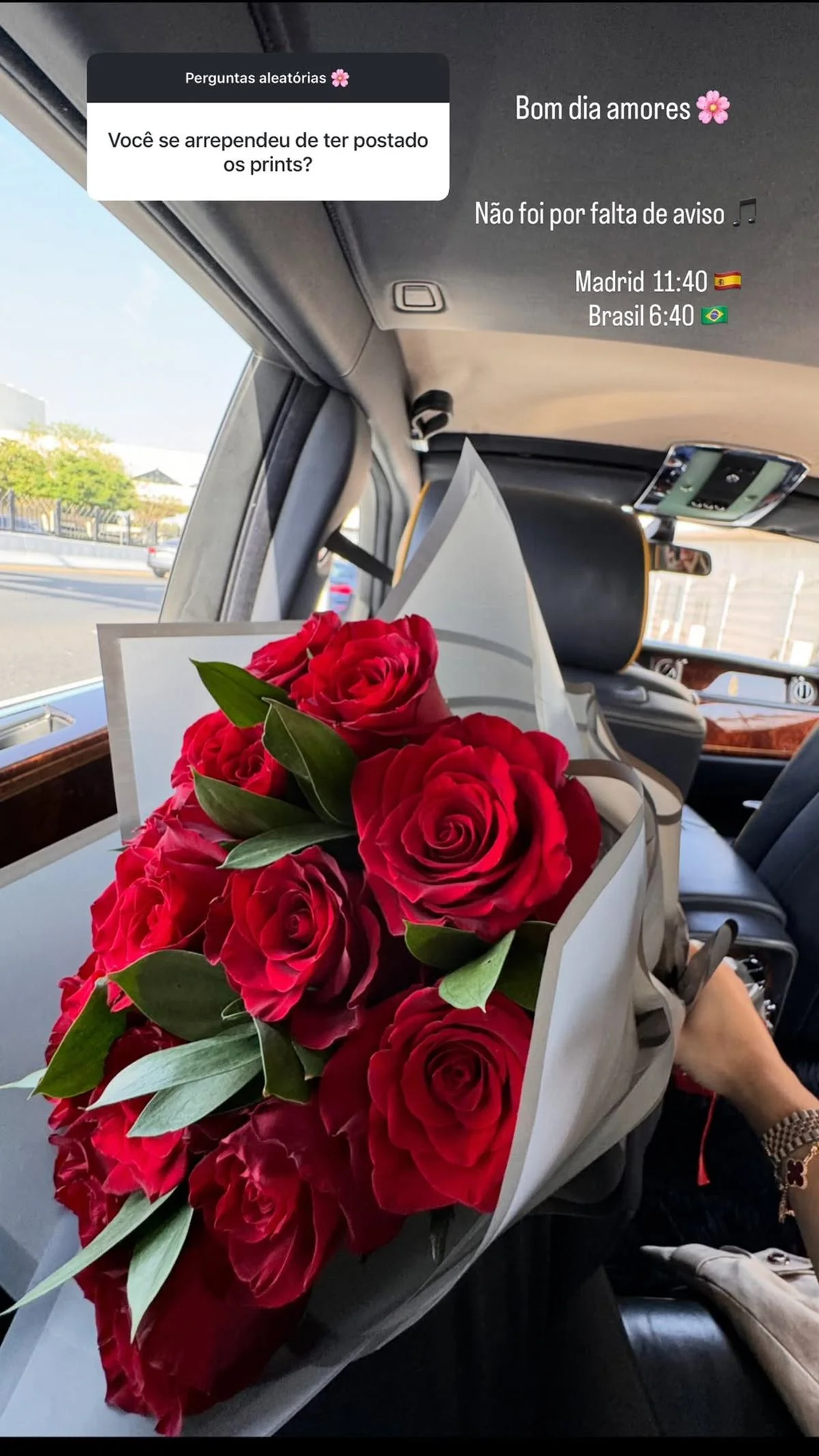 Atualmente em Madrid, Day compartilhou uma foto de um buquê de flores acompanhada da frase: “Não foi por falta de aviso.”